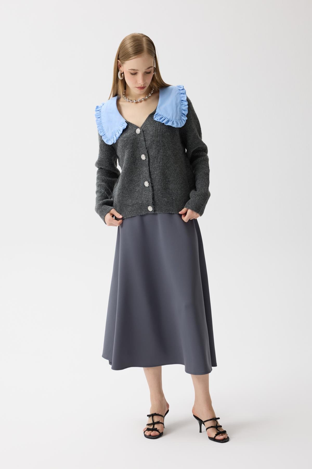 Bianca Bebe Yaka Hırka, diğer trikolardan farklı olarak bebe yaka poplin garnisi ile kumaş kombinasyonu sevenler için tasarlandı. Jean pantolonlarla ya da etekler ile kombinleyebilirsin.