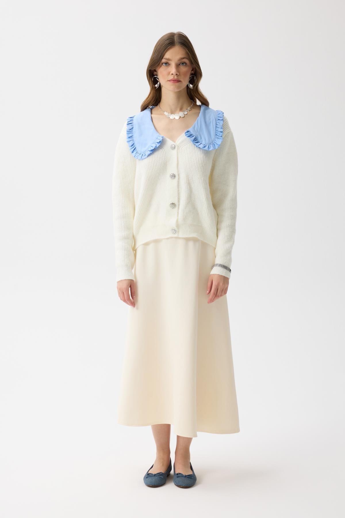 Bianca Bebe Yaka Hırka, diğer trikolardan farklı olarak bebe yaka poplin garnisi ile kumaş kombinasyonu sevenler için tasarlandı. Jean pantolonlarla ya da etekler ile kombinleyebilirsin.