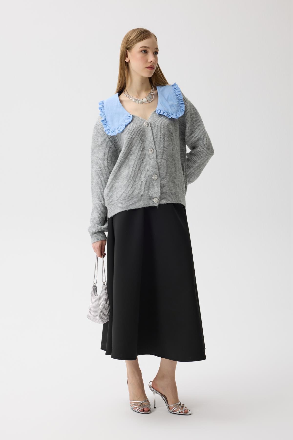 Bianca Bebe Yaka Hırka, diğer trikolardan farklı olarak bebe yaka poplin garnisi ile kumaş kombinasyonu sevenler için tasarlandı. Jean pantolonlarla ya da etekler ile kombinleyebilirsin.
