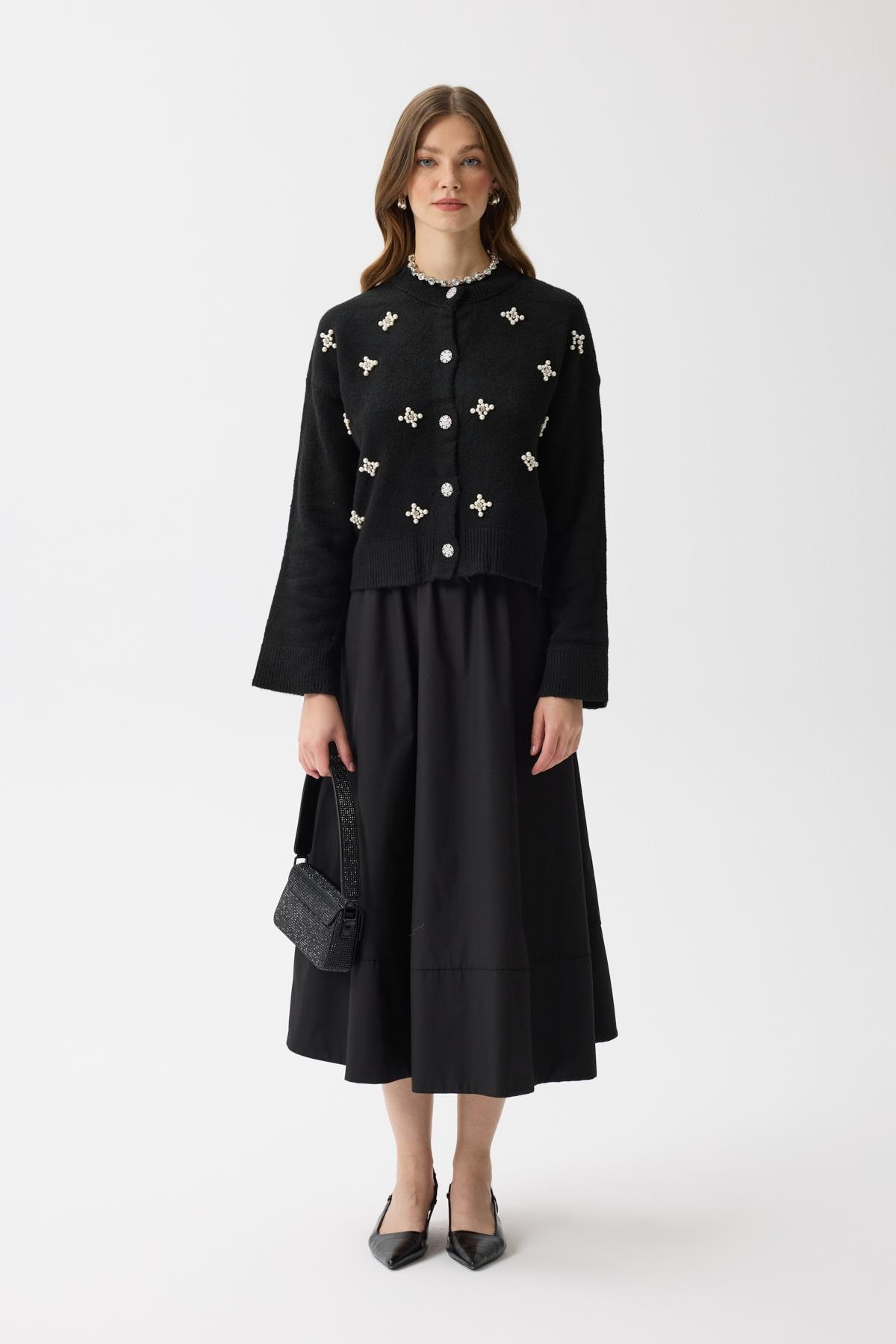 Cresida İnci İşlemeli Hırka hem form hem de inci işlemeleri ile günlük şıklığınızın bir parçası olacak. Triko dokusu ile tüm gün sıcak tutacak yapıda olup kışın vazgeçilmez ürünü olacak.