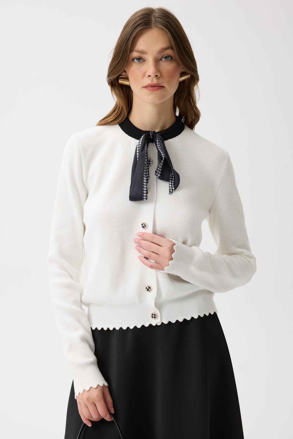 Fular detayı ile klasik görünüm elde edeceğin Emma Fularlı Hırka, kazayağı detayları ile buluşturuldu. Manşet ve etel ucundaki kesim sayesinde farklı bir görünüm sağlar. Arya skuba etekler ile kombinini tamamlayabilirsin.