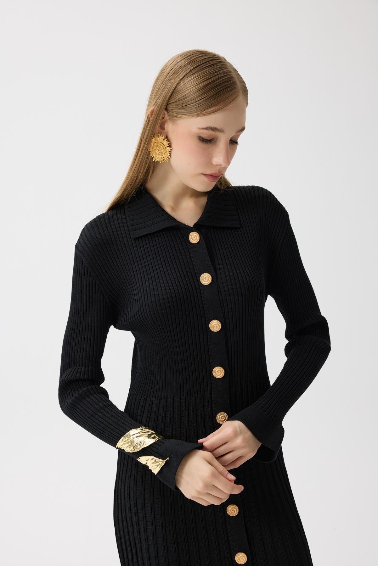Mona Fitilli Gold Düğmeli Elbise - Siyah