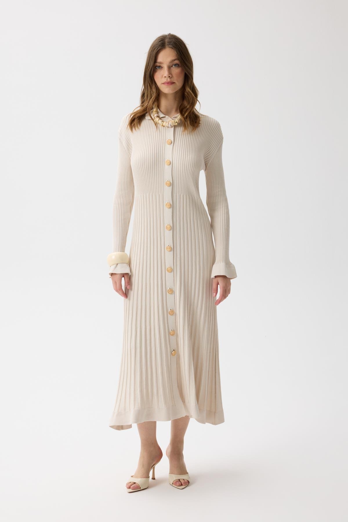 Mona Fitilli Gold Düğmeli Elbise, fitilli triko yapısı ile uzun silüet sağlayacak olup hem günlük kullanıma hem de özel günlerde tercih edebileceğin formda üretildi.