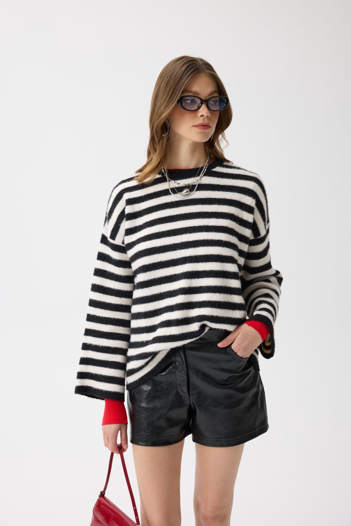 Oversize yapısı ve angora dokusu ile soğuk kışta tercih edebileceğin Olga Kontrast Kazak, ister etekler ile ister jean ya da deri pantolonlar ile görünümünü tamamlayabilirsin.