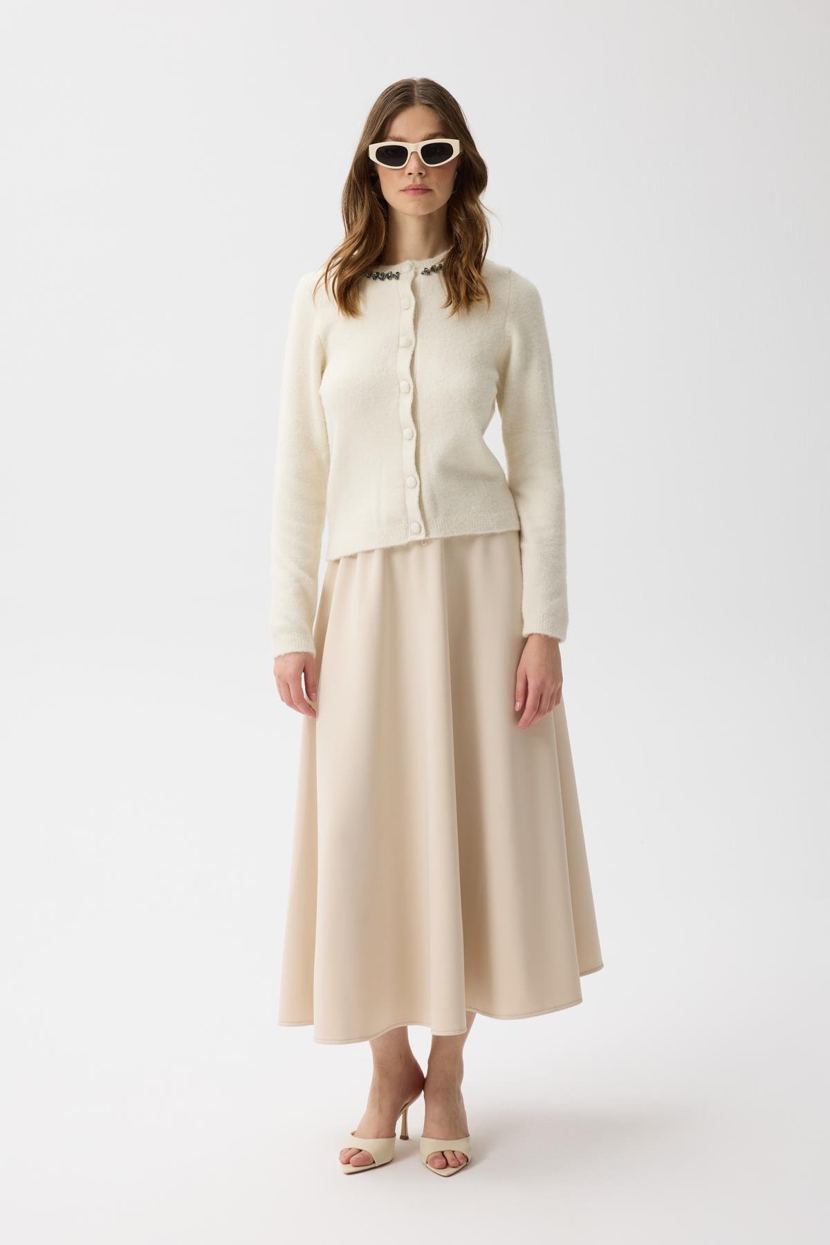 Victoria Yaka Taşlı Hırka, Arya Skuba Etek ile kombinleyeceğin günlük kulanıma elverişli ve şıklığı yakalayabileceğin parçalardan biri.