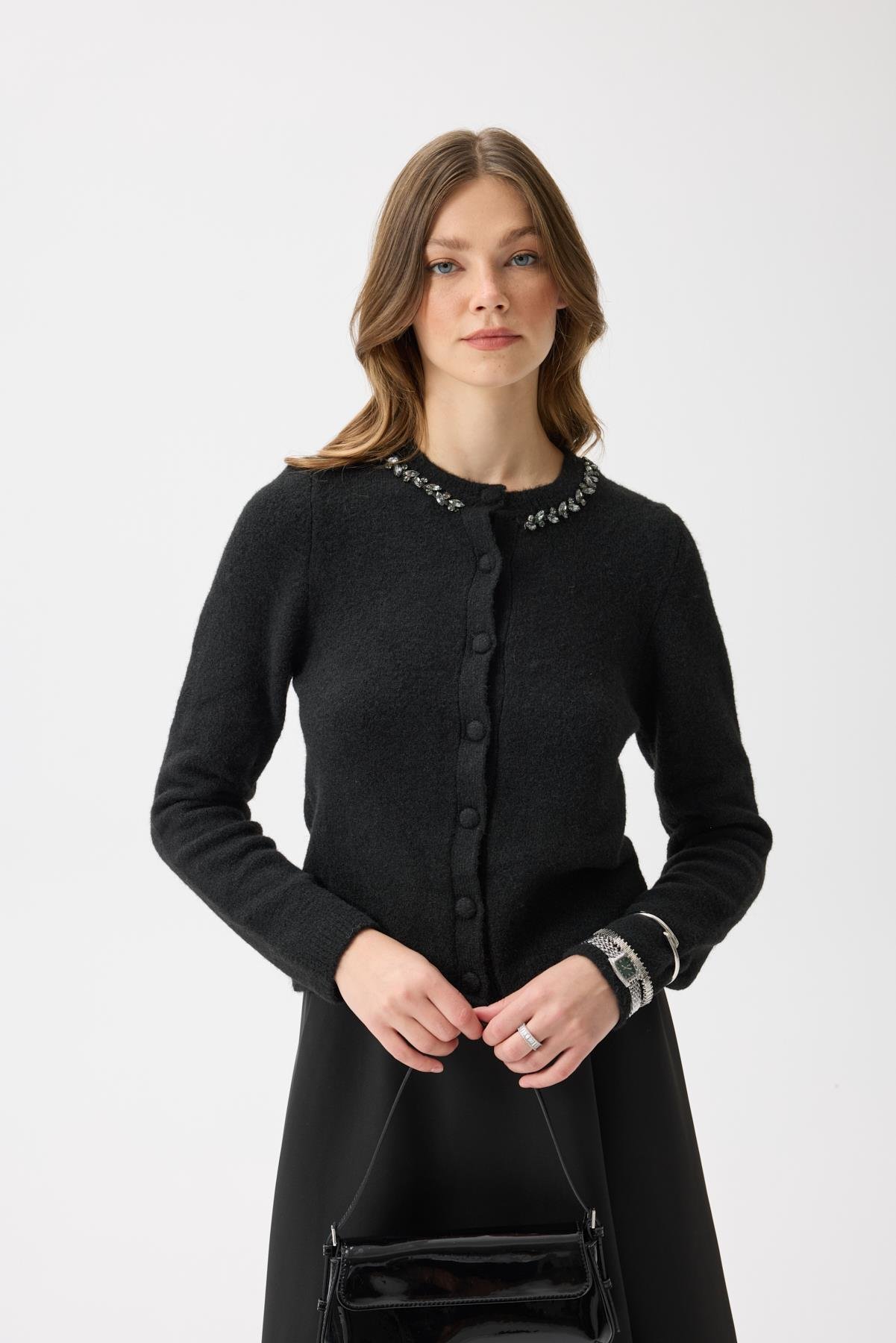 Victoria Yaka Taşlı Yünlü Hırka - Siyah